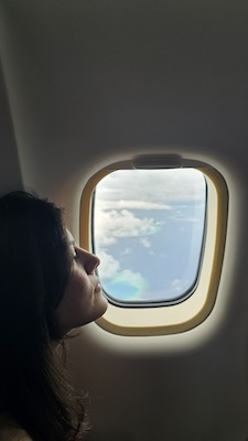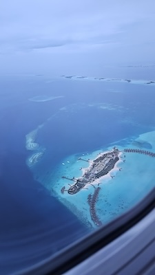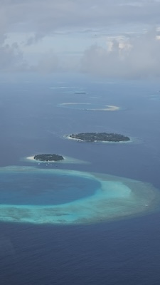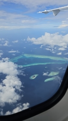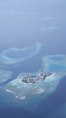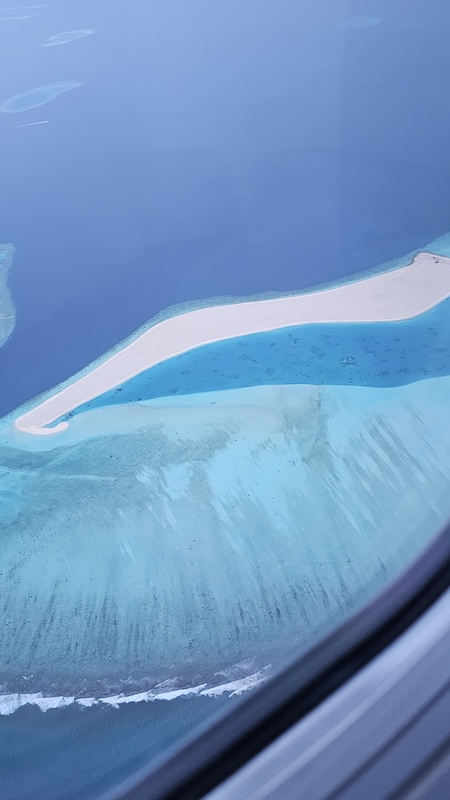 Stiamo per assistere al primo vero spettacolo di questo viaggio: sorvolare gli atolli. E non appena l’aereo si alza in volo, si apre davanti a noi un panorama mozzafiato, una costellazione di isole e lingue di sabbia bianchissime su uno sfondo dalle mille sfumature di blu.